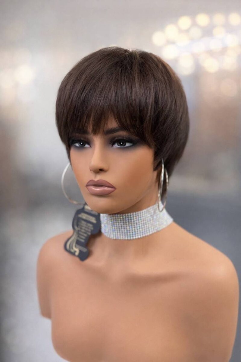 Короткая стрижка пикси с удлинённой челкой подчёркивает скулы и открывает шею, создавая утончённый и уверенный образ