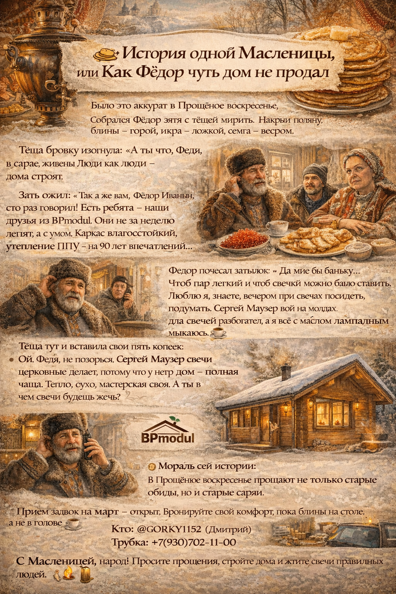 Было это аккурат в Прощёное воскресенье. Собрался Фёдор зятя с тёщей мирить. Накрыл поляну: блины — горой, икра — ложкой, сёмга — веером. Тёща глянула на стол, крякнула, но молчит. Зять сидит ни жив ни мёртв — прошлогодний скандал про незабитый гвоздь никто не отменил. И тут Фёдор как хлопнет себя по лбу: — А погреться-то где? Баню топить — полдня ждать. Да и холодно у меня в предбаннике, сквозняки гуляют… Тёща бровку изогнула: