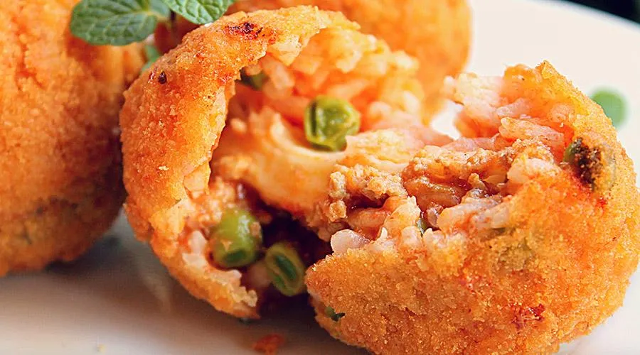 Круглые рисовые шарики с ароматным фаршем, мелким зеленым горошком и овечьим сыром обваливались в яйцах, затем в муке, затем опять в сырых яйцах, затем в панировочных сухарях и выставлялись на подносе на витрине.