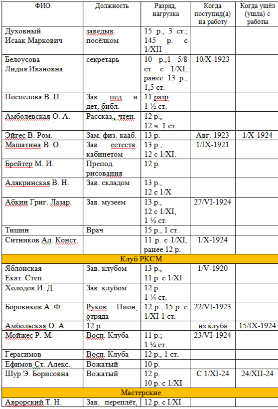 14) Лично-штатная ведомость № 1207. 19 января 1925. Педагоги и персонал МДП, ст. Малаховка МКЖД.