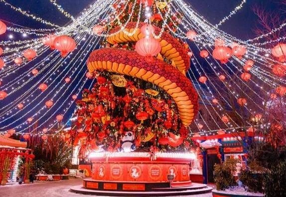 Главную новогоднюю ель обвивает 25-метровая фигура красного дракона, а на переходе к площади Революции центральную ель обнимает пятиметровая панда.