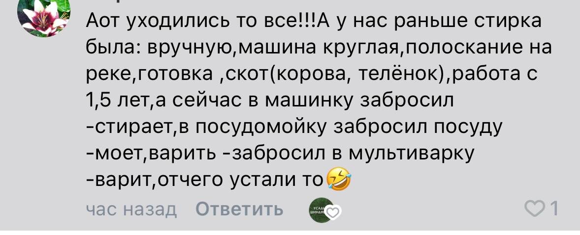 ! 🤣 Блин, да раньше воспитывали всей деревней, а сейчас каждая в одиночку. Раньше ели все с одного чугунка, а сейчас первое, второе и десерт. Раньше было 2 платья и 1 сорочка, а сейчас каждый день в новом ходишь. Раньше мылись 1 раз в неделю, а сейчас 1 раз в день минимум. Раньше лампы керосиновые были, а сейчас электричество есть, благодаря которому ты работаешь пока не солнце село, а пока ты всю работу не сделаешь. Раньше родители учили, даже забирали на себя большую часть обязанностей за внуками, а сейчас есть интернет, где мы, новоиспеченные мамы сами узнаем что нам и как нам делать. Раньше фильмы смотрели только в кинотеатрах, а сейчас это обычный день посмотреть вечером фильм. А сколько болячек развелось? Для каждого ребенка своя еда, свои какие то особенности. А ещё раньше ведь с соседям детей оставляли, и забирали соседи детей с садов. Сейчас почти такого не встретить. Вообще можно долго это продолжать 😀