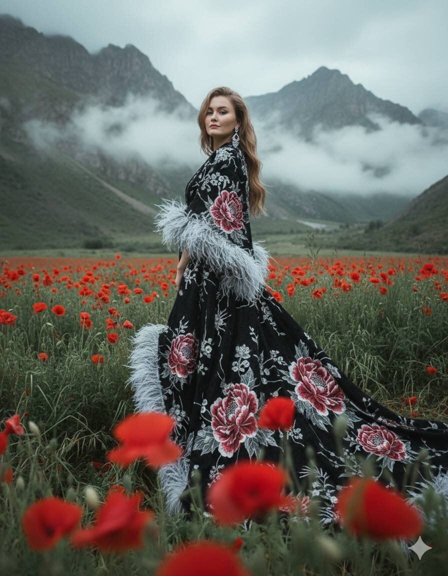 Композиция: низкая точка съёмки, чтобы цветы на переднем плане дали глубину, а горы и туман — масштаб; лёгкая диагональ шлейфа ведёт взгляд к лицу. Свет: мягкий рассеянный (overcast), нежный контровой от просвета в облаках, тонкие блики по вышивке и пушистой отделке; цветокоррекция в стиле cinematic editorial, натуральные оттенки, чуть холодный воздух и серебряные акценты в платье. Оптика: 50–85mm, малая глубина резкости, красивое боке цветов на переднем плане, на самом переднем плане несколько маков максимально размыты, придавая глубины кадру, высокая детализация ткани и вышивки, тонкое плёночное зерно, subtle halation, лёгкая виньетка, ощущение кадра из арт‑фильма, ultra realistic, high fashion, magazine cover mood
