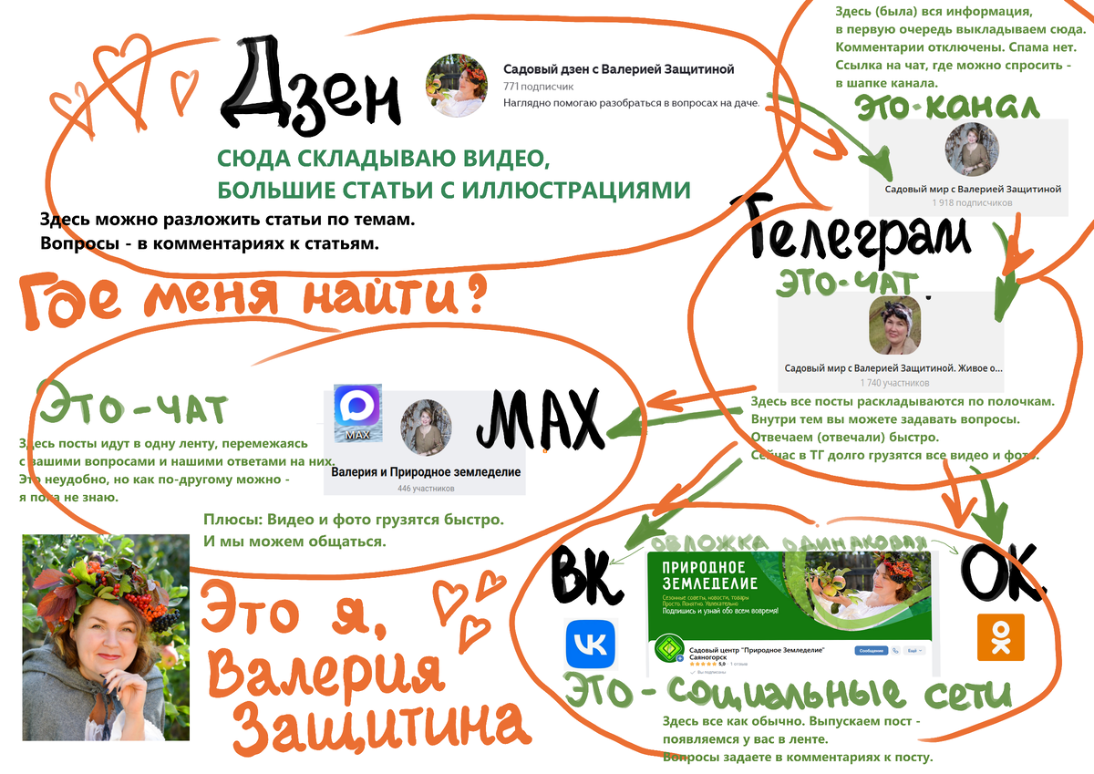 Это - схема, по которой мои подсказки, посты, истории, видео и картинки разбегаются по миру. До сего дня они начинались в Телеграм. Теперь я привыкаю начинать с Дзена. Там тоже можно всё разложить по полочкам. Вопросы мне лично можно писать в комментариях. Правда пока не понятно, куда там "прикрутить" ответы на вопросы, возникшие вне темы. Но, думаю, разберемся. Дзен: Садовый Дзен с Валерией Защитиной - https://dzen.ru/sad_valeria