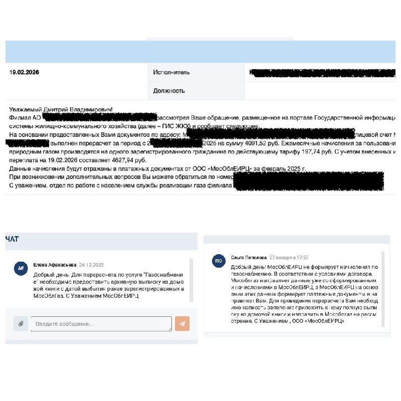 В моей платежке за газ почему-то числилось 4 человека, хотя по факту проживает меньше. Сначала пошел в ЕИРЦ. Это такой расчетный центр, формирующий платежи. Там меня «отфутболили». Написали, что перерасчет не их забота. Надо идти прямиком к ресурсникам. Чтобы не бегать по офисам, я зашел в ГИС ЖКХ и отправил обращению напрямую в компанию, поставляющей газ. Прикрепил документы: выписку из домовой книги (свежую и архивную), бумагу на собственность и кривую платежку. В итоге мне ответили, что вернут деньги. Теперь на счету переплата больше 4 тысяч. ВОПРОС: Зачем вручную переносить данные из одного «окошка» в другое? Я онлайн получаю выписку из домовой книги, выписку ЕГРН. Информация о моей прописке есть в базах. Даже платежка электронная. Очень хотелось бы, чтобы данные передавались автоматически. И также автоматически происходил перерасчет за коммунальные услуги.