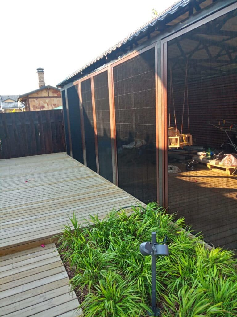 Представьте: теплый вечер, вы собрались семьей в беседке, разожгли мангал… и через 15 минут ретируетесь в дом, потому что полчища комаров и мелкой мошки превратили отдых в борьбу за выживание. Знакомо? Многие пытаются решить проблему «малой кровью»: вешают тюль, сетки на липучках из супермаркетов или дешевые рамки. Но в 90% случаев это деньги на ветер. Разбираемся, как закрыть беседку от насекомых раз и навсегда. Беседка — это не окно на кухне. Здесь проемы часто достигают 3–5 метров в ширину. Обычную рамочную сетку такого размера сделать невозможно: ее выгнет дугой или вырвет первым же порывом ветра. Открытая веранда или беседка — это всегда сквозняк. Обычное сеточное полотно под напором ветра работает как парус: оно растягивается, вылетает из пазов или рвется. Если ваша дача у леса или воды, вы знаете: обычный комар — это полбеды. Настоящий кошмар — это мелкая мошка, которая пролезает сквозь стандартную ячейку сетки как сквозь открытую дверь. Мы в Alumdevelop производим системы мо