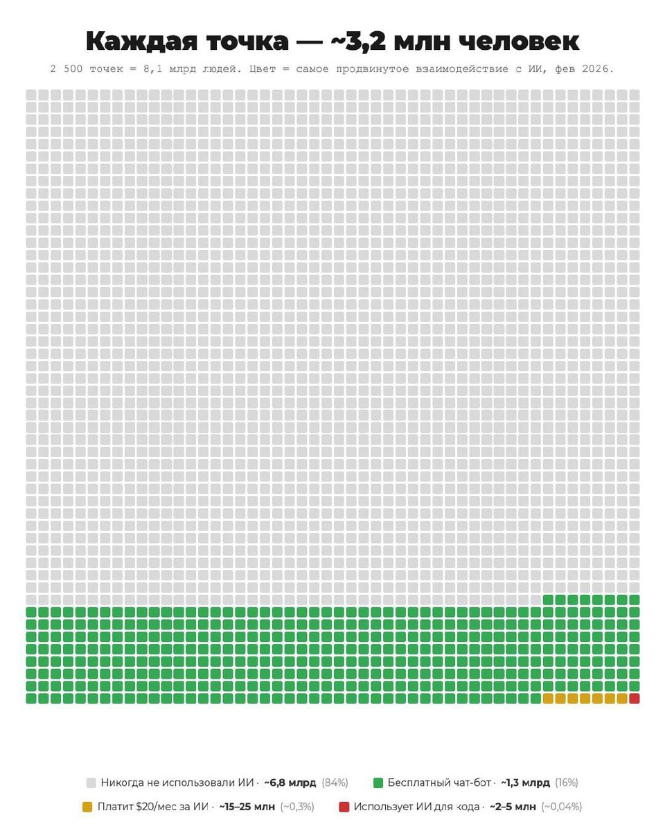 Ни ChatGPT. Ни Midjourney. Ничего. Вот разбивка: ~6.8 млрд человек — никогда не пробовали ИИ ~1.3 млрд — бесплатные чатботы. Это 16% ~15-25 млн — платят $20/мес за подписку. 0.3% ~2-5 млн — пишут код через Claude Code или Cursor. 0.04% Большинство фаундеров думают, что «ИИ уже везде». Не-а. Даже близко нет. Создание контента возможно только при свободном владении ИИ. Это обязательный навык. Если ты читаешь этот пост — ты уже в топ-1% пользователей ИИ на планете. Разрыв между теми, кто строит навыки сейчас, и теми, кто ждёт — будет только расти. Это как dial-up в 1998-м. Те, кто тогда «разбирался в интернете», потом строили компании. Какой у вас прогноз на отрыв тех, кто в теме? P.S. Тот, кто не пользовался ИИ не считывает ИИ контент… поэтому вы паритесь только потому, что вы в контексте.