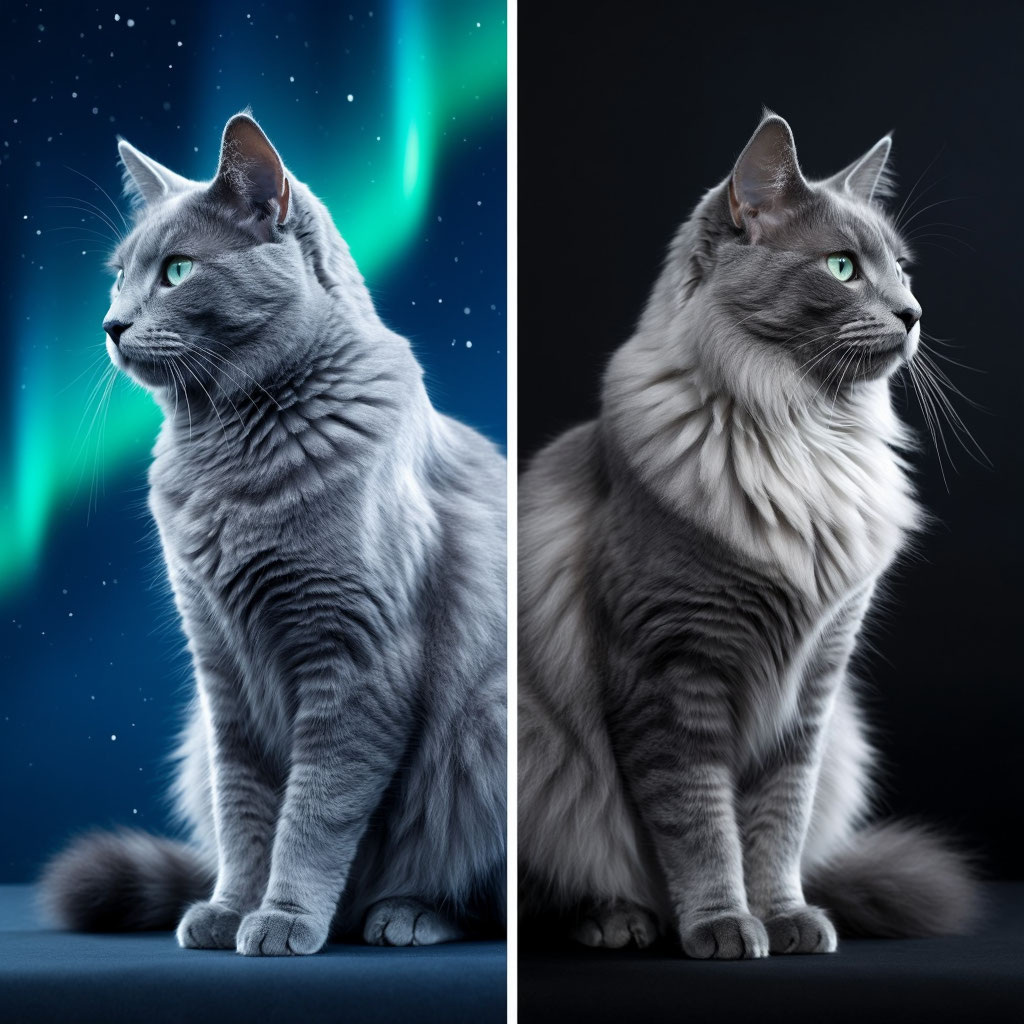 Ключевое различие: Русская голубая — кошка холода (плюш как защита от мороза). Нибелунг — кошка тумана (длинная шерсть как растворение в воздухе). Одна — кристалл. Другая — дымка.
