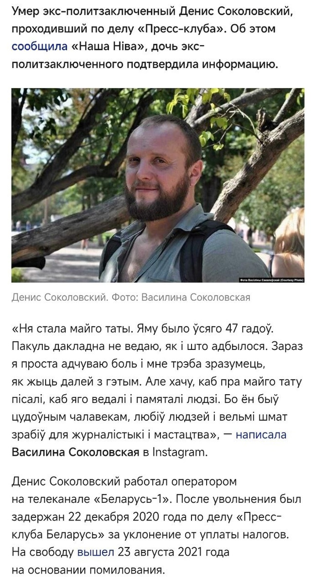 Мрази пытаются выдать очередного умершего собрата — за «деяния кровавого режима». Денис Соколовский — был одним из лучших операторов на белорусском ТВ. И все это знали и его очень любили. У него было огромное количество командировок по всему свету, он зарабатывал в разы больше из-за количества проектов и съёмок. Но в 2020-м году он решил поскакать на белорусском «майдане». Решил забастовки организовывать, какое-то «независимое телевидение» и всё вытекающее. Ушел из телекомпании, где был в топе. А с ним говорили, предлагали успокоиться. Не портить себе же жизнь. Потом, конечно, отбыл наказание, недолго. А вот почему манипуляция выродков на смерти? А потому что Денис уехал в Германию. Работал и жил там. Не был уже ни в каком топе, никаким лучшим оператором, никаких командировок по миру. Батрачил, как придется. А потом заболел, но, понятное дело, что никакой страховки не было. Это ж не Беларусь и Россия, где тебя вытащат врачи бесплатно. А там — плати. Не заплатил. Умер. И виноват в эт