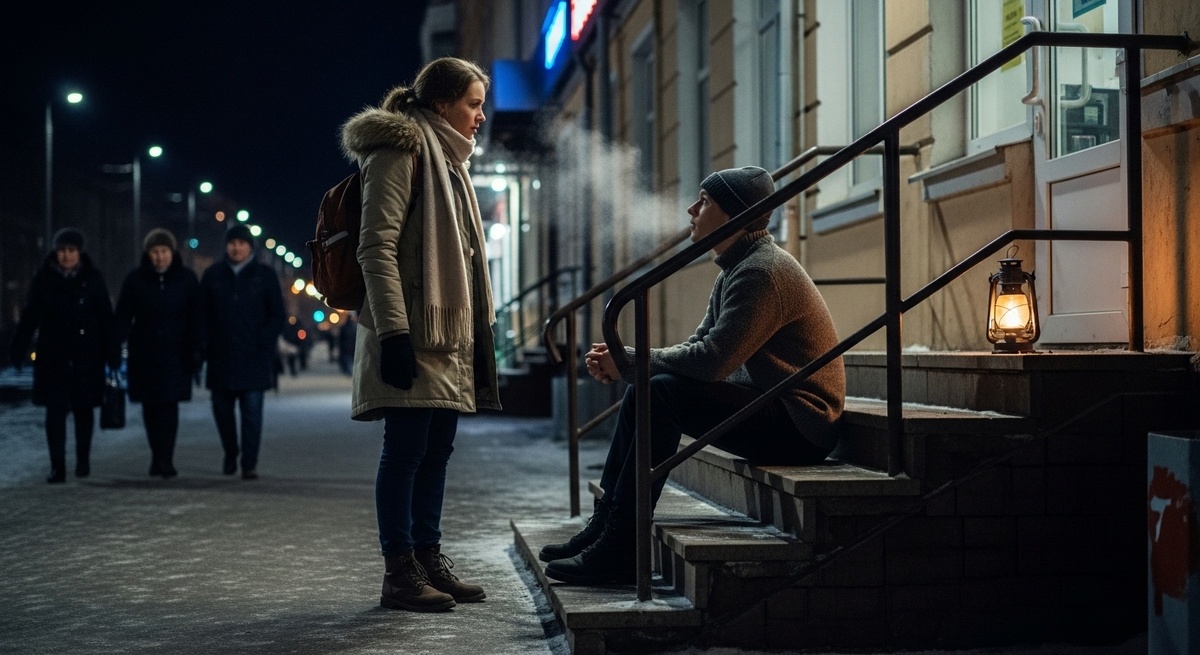 Один холодный вечер. Одни ступеньки. Один человек без шапки в мороз — и все остальные прошли мимо, а она остановилась. Не потому что рассчитала. Не потому что знала, чем кончится. Просто — остановилась. Потому что так правильно. Потому что иначе не умеет.