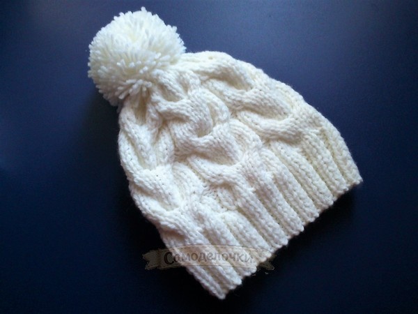 Стильная и объёмная вязаная шапочка с помпоном актуальна не только для детей, но и для взрослых. Она прекрасно сочетается и с курткой, и пуховиком, и с некоторыми моделями пальто, полушубков. Кроме того, связать такую шапочку довольно несложно. Что для этого потребуется? Во-первых: · тёплая пряжа (шерсть, полушерсть 250-240 м в 100 гр) – 1 моток; · спицы №4 · дополнительная спица; · игла и ножницы. А во-вторых, немного времени и терпения. При желании шапочку можно осилить за 3 часа. Итак, начнём. Набираем основу – 84 петли (в 2 нити) и провязываем их резинкой 2х2. Нужно связать 12 рядов. Затем приступаем к вязанию самого рисунка, подглядывая в схему 1. Но сначала нам нужно сделать 2 прибавления с тем учётом, что раппорт составляет 14 петель (12 петель коса и 2 петли изнаночные между косами), а нам нужно сделать 6 раппортов и дополнительно 2 кромочные петли. Получается 86 петель. Вяжем до первого перекрещивания 6 рядов. После этого выполняем первый перехлёст пете