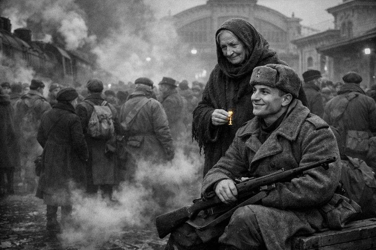 Я всегда знала, что Москва умеет помнить шаги. Но в ноябре 1941 года эта память звучала особенно громко, будто каждый камень говорил вслух. Я вышла к Белорусскому вокзалу ранним утром, когда пар от дыхания людей смешивался с дымом паровозов, а небо было низким и серым, как шинель. Меня зовут Оса. Я появляюсь там, где время сгущается, и исчезаю, когда узел развязан. В тот день город провожал своих. Платформа гудела голосами. Новобранцы и ополченцы стояли плотными рядами, кто в новой форме, кто в старом пальто, перешитом наспех. Женщины держались прямо, будто боялись согнуться, дети цеплялись за рукава, а мужчины улыбались неловко, словно извиняясь за будущую разлуку. Я слышала, как вокзал запоминает их шаги, чтобы однажды вернуть. Камни здесь были терпеливыми, они знали цену ожиданию. Я заметила его сразу. Он сидел на ящике, перебрасывая винтовку с колена на колено, и рассказывал что-то весёлое, отчего все вокруг смеялись. Василий Теркин. Я знала это имя задолго до встречи, так же как з