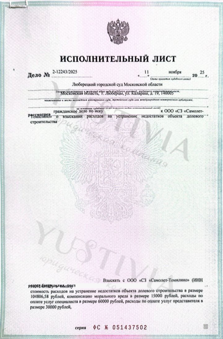 : ООО "СЗ "САМОЛЕТ-ТОМИЛИНО" ЖК: ТОМИЛИНО ПАРК ➿➿➿➿➿➿➿➿➿➿ О взыскании компенсации за строительные недостатки по договору долевого участия Люберецкий городской суд Московской области Дело: 2-12243/2025 Площадь: 33,20 м² Судья: Савинова М.Н. ➿➿➿➿➿➿➿➿➿ Взысканные суммы: ➡️Недостатки: 104 806,58; ➡️Моральный вред: 15 000; ➡️Суд. расходы: 94 272,03. ➿➿➿➿➿➿➿➿➿ 💸Итого: 214 078,61 рублей. ❤️При заключении договора на взыскание компенсации с застройщика за некачественную отделку мы оплатим за Вас строительно-техническую экспертизу! Лучше звоните Юсти🆗 ➿➿➿➿➿➿➿➿➿ 📞+7 (936) 333-33-48 ✅@Yustivia 🌐yustivia.ru ➕Яндекс услуги
