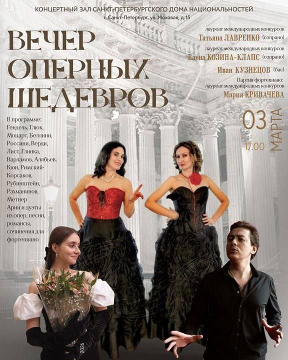 Рахманинова. 🗓️ 3 марта в 17:00 Санкт-Петербургском Доме национальностей вы услышите, как бегущая следом за Орфеем Эвридика плачет о том, что Орфей разлюбил её, Лепорелло насмешливо перечисляет возлюбленных своего господина, граф Родольфо трогательно радуется, возвращаясь в места своего детства, Леонора просит Бога об упокоении и смерти, думая, что её любимый погиб... 🎵 Живая, волнующая, вечная классика, от которой замирает сердце. Гендель, Моцарт, Глинка, Чайковский, Рахманинов... Путешествие в мир вечной красоты, любви, преданности и сюжетов из человеческой жизни. Вихрь страсти. Жизнь, слёзы, и любовь. 🎼 Всё это вы сможете пережить за один «Вечер оперных шедевров» во вторник, 3 марта, благодаря талантливому исполнению наших артистов. Артисты уже готовятся, чтобы поделиться с вами своим талантом и вдохновением ! Дорогие зрители, до встречи 3 марта !