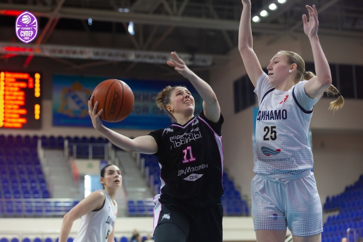 Сегодня в Курске прошёл матч регулярного чемпионата России по баскетболу (Суперлига). Местное «Динамо-Фарм» принимало на своей площадке «Владимирских львиц». «Львицы» одержали победу со счётом 76:54 (17:8, 22:19, 18:13, 19:14), продлив серию выигрышных матчей до трёх. Самыми результативными в нашей команде стали: Дарья Гончарова (14 очков), Светлана Крамар (12 очков), на счету Екатерины Карпук и Дианы Поповой по 10 очков. Сейчас «Владимирские львицы» идут на второй строчке турнирной таблицы с 43 набранными очками. На первом месте располагается вологодская «Чеваката» с 42 баллами, но у наших соперниц одна игра в запасе. В следующем матче «Львицы» сыграют на выезде против «Спарты энд К-2» из подмосковного Видного. 0+