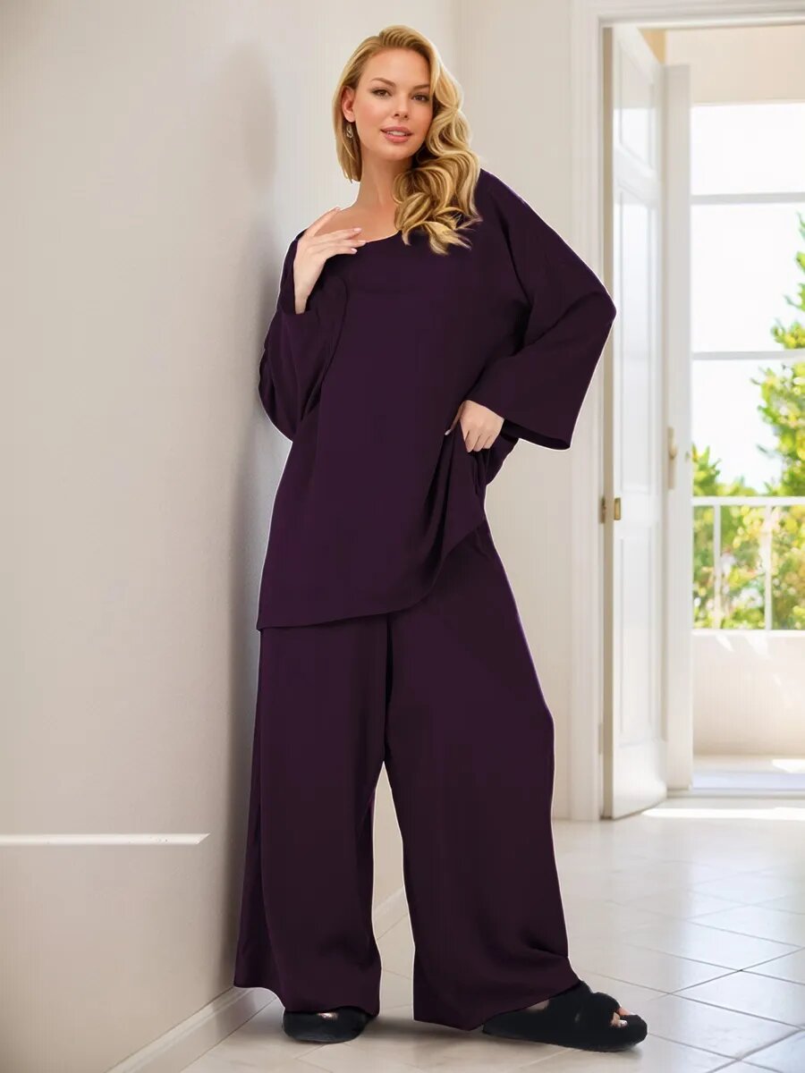 Стильный дизайнерский домашний костюм из 100% вискозы — это сочетание комфорта и элегантности. В комплект входит блузка оверсайз с длинными рукавами и широкие брюки палаццо с высокой посадкой.
