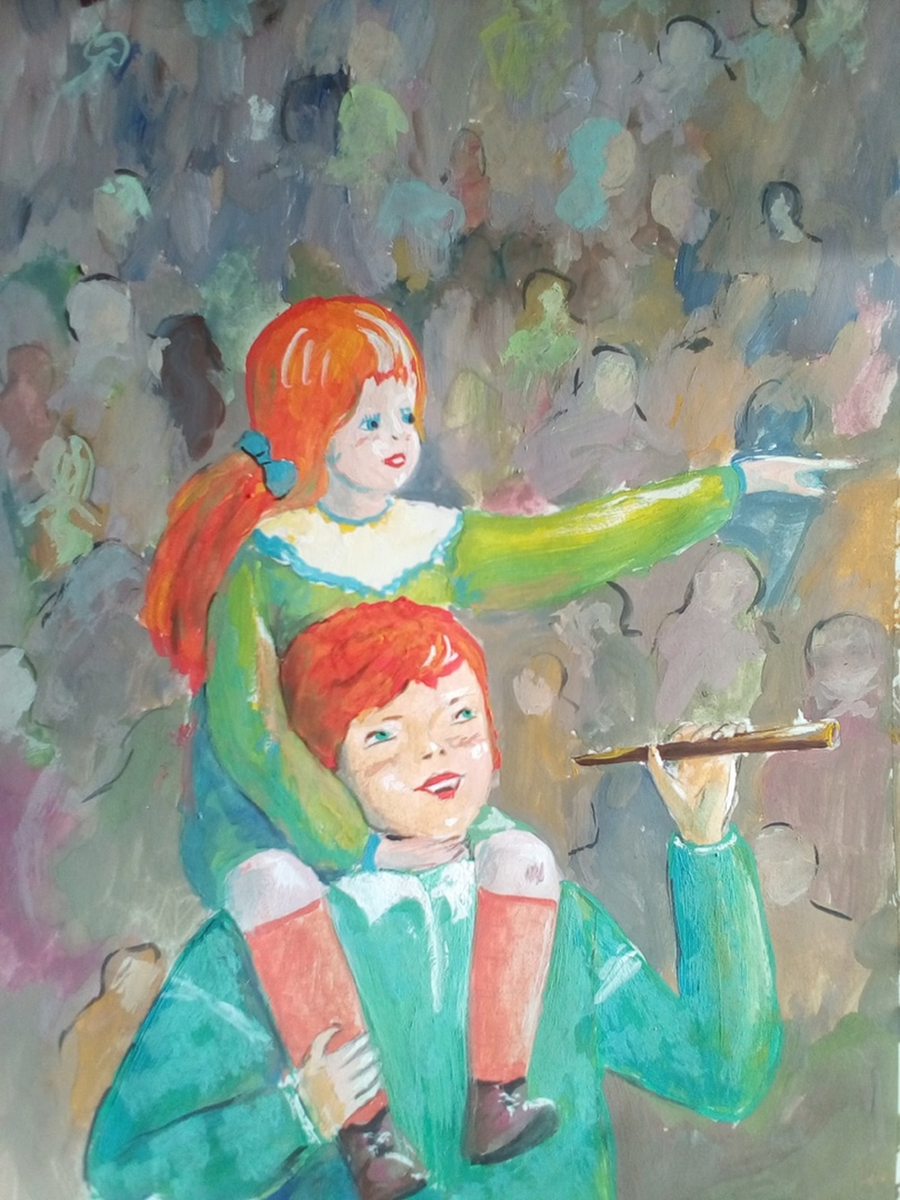 - «Не реви! – сказал Колин строго. Всё-таки он хоть и ребёнок ещё, но будущий мужчина. – Садись ко мне на плечи и высматривай свой дом с красивыми окнами. А я сейчас на дудочке буду играть, все и замолчат, перестанут суетиться. Может, и найдём твоего отца.»