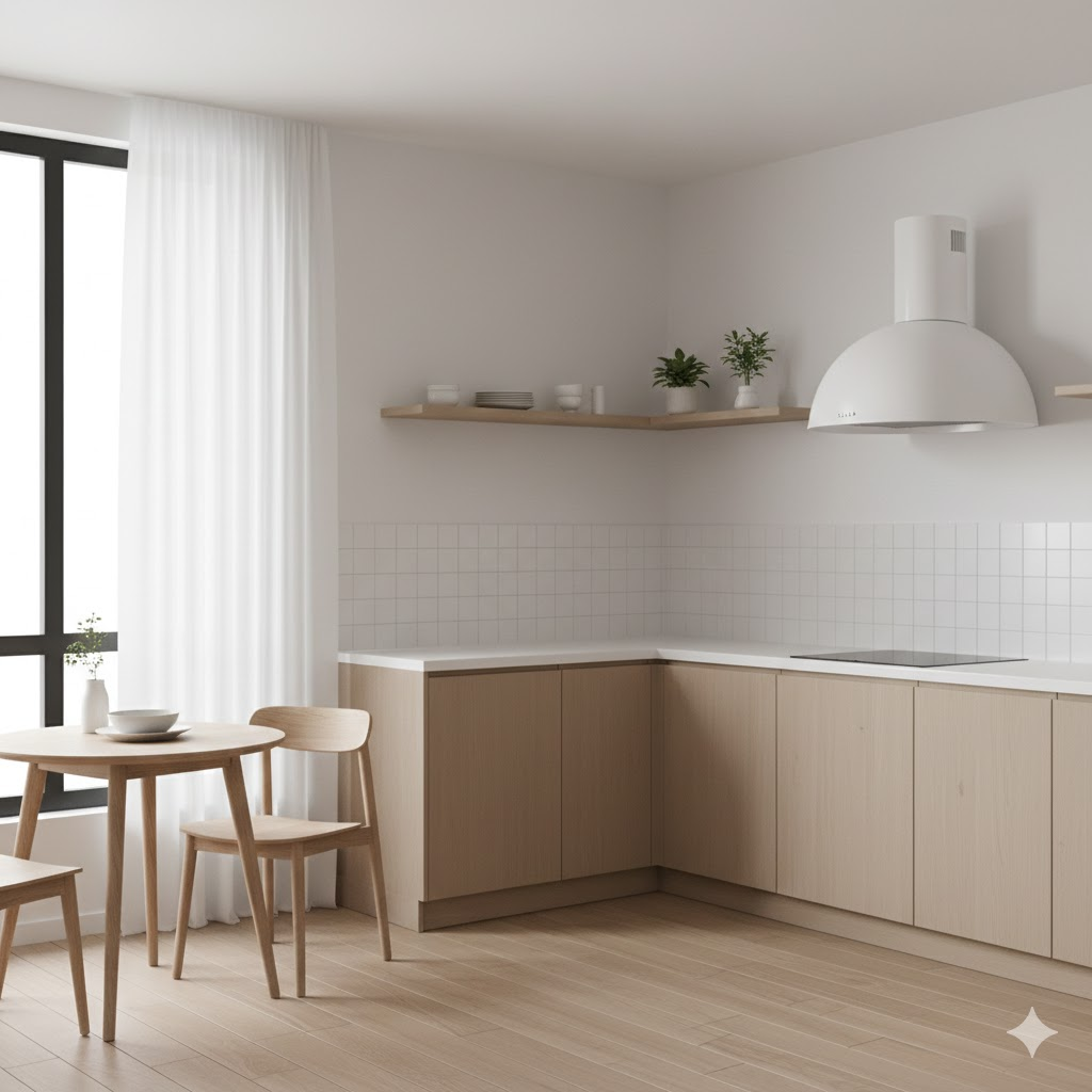 Расположите вытяжку строго по центру стены, а по бокам повесьте одинаковые светильники или поставьте одинаковые кашпо с зеленью. Симметрия успокаивает глаз и делает маленькую кухню более организованной.