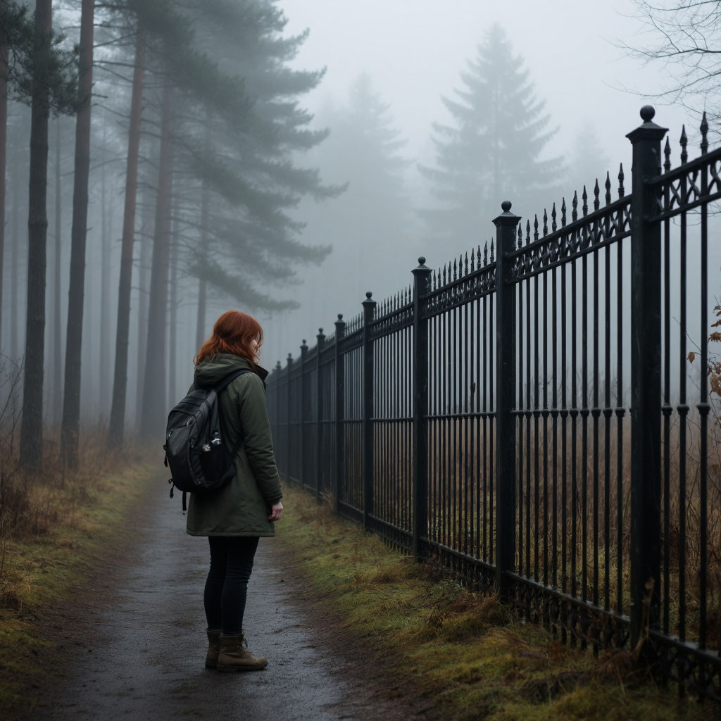 Туман стелился над лесом, окутывая деревья призрачной дымкой. Ольга, в тёмной одежде и с рюкзаком за плечами, замерла у опушки. Впереди, в сотне метров, виднелся забор дачи — высокий, из кованого железа.