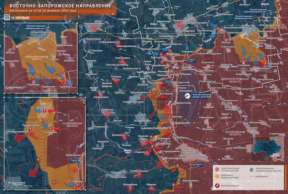 обстановка на Восточно-Запорожском направлении Украинские формирования продолжают попытки расширить площадь вклинения в районе Орестополя. Некоторое время назад уже поступала информация о прорыве ВСУ в Терновое, однако только сейчас это удалось подтвердить визуально. Судя по кадрам от росcийских дроноводов, как минимум два бронеавтомобиля противника заехали на территорию села и высадили десант. Его западные окраины на данный момент остаются в «серой зоне», в то время как в восточной части сохраняется присутствие российских подразделений. ➡️Из-за «временного лага» в публикации видео и нестабильных погодных условий пока что невозможно установить актуальную конфигурацию фронта на участке. Подобный «туман войны» сохраняется на всей территории от Тернового до Орестополя, где позиции обеих сторон оказались перемешаны между собой. ➡️Параллельно с этим со стороны противника поступили заявления о занятии им Радостного. В качестве доказательства приводится видео подъема флага якобы на стеле у въ