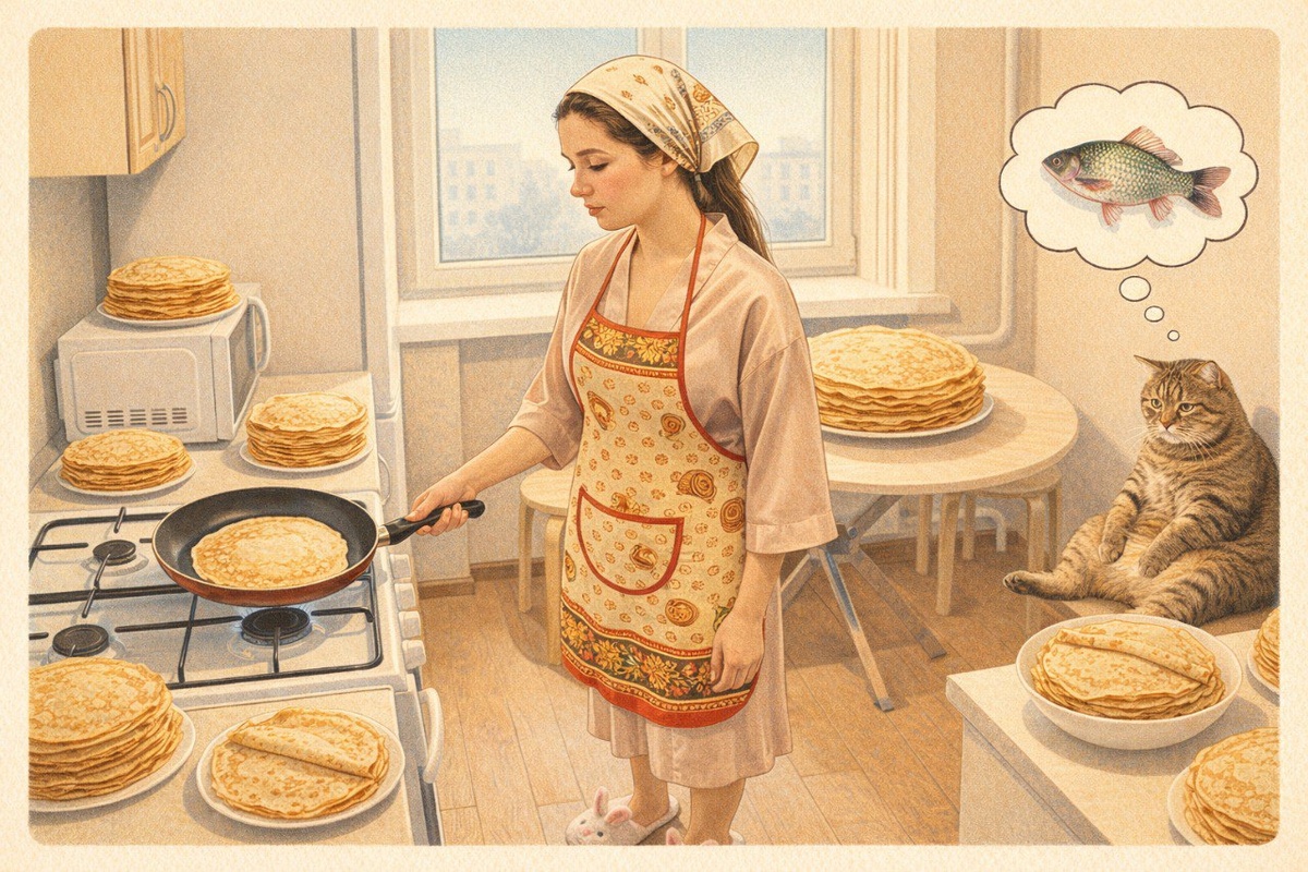 Участник конкурса в ТОП-10. Создать открытку иллюстрацию: винтажная романтическая американская открытка середины XX века, чистые контуры, аккуратная печатная текстура, лёгкая зернистость бумаги, мягкая пастельная палитра, выразительные тени, ретро иллюстративный реализм, как журнальная реклама 1950-х. Реалистичное фото, на котором изображёна женщина готовящаяся к масленице. Условия съёмки и детали: 1. Поза и расположение: * Молодая симпатичная женщина стоит на кухне повернувшись к кухонной плите; * в правой руке ручка от сковороды в которой печется блин; * все газовые конфорки горят. * взгляд направлен на сковороду, выражение лица устало-напряженное. 2. Одежда: * на женщине надет шелковый халат.Поверх него фартук блинных цветов; * волосы подвязаны косынкой или ободком; * на ногах домашние тапочки в виде зайчика. 3. Обстановка: * кухня обычной хрущевки с одним окном.Мебель и плита новые; * за окном — размытый дневной пейзаж (можно намекнуть на городской или пригородный в