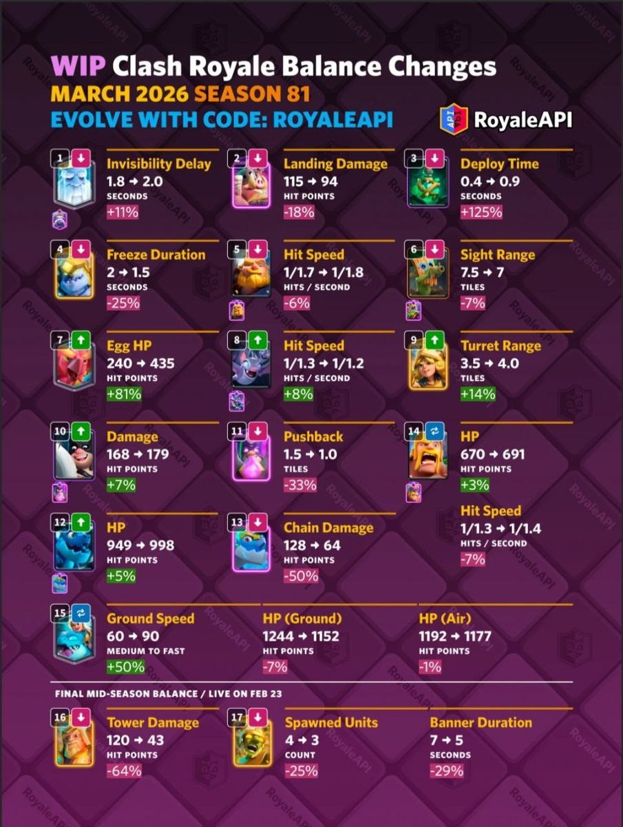 Смутные сомнения, что ей начнут играть с таким реворком, но посмотрим. Много раз говорил, что основной смысл наземной формы - защита, когда мало эликсира, поэтому, лично я, не особо понимаю смысл усиления её скорости и ослабления здоровья, лучше бы подняли скорость атаки. Но опять же, посмотрим.
