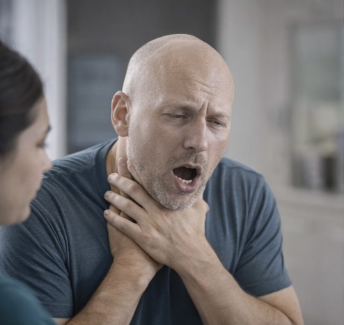 · При удушье (обструкции дыхательных путей): Человек не может говорить, дышать или кашлять. Он может хвататься за горло руками (универсальный знак подавившегося человека). Лицо краснеет, затем синеет.