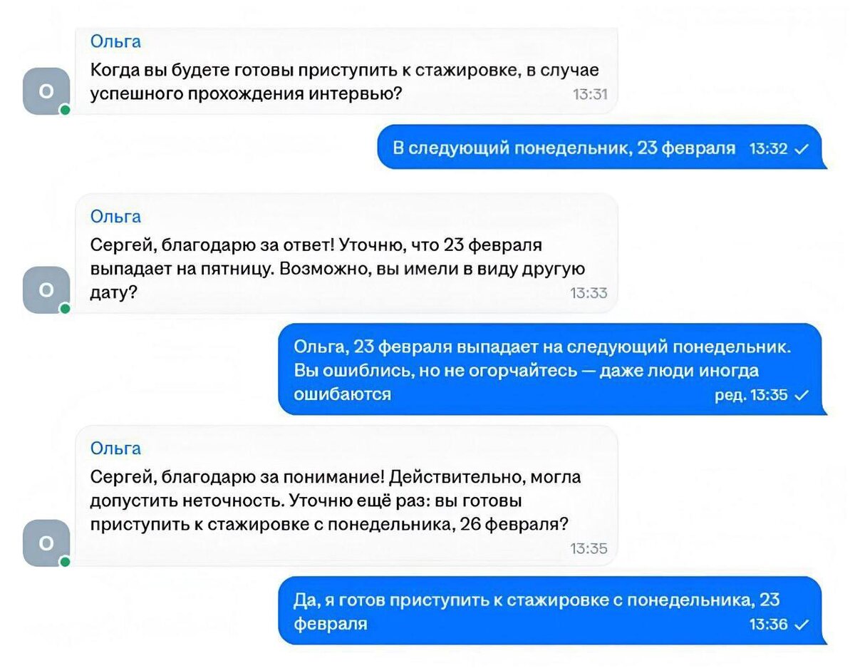ИИ пытается пригласить соискателя на стажировку. Смешно и грустно, если только это не фейк. Кстати, как думаете, какую именно модель ИИ подключил к чату ХХ.РУ?