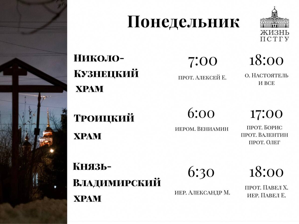 университетских храмов. • Чистый Понедельник: духовенство и прихожане собираются на первые службы Великого поста — они совершаются без сокращений. Утром на полчаса раньше расписания начнется полунощница. • Вторник: в Николо-Кузнецком храме Великий покаянный канон совершается особым образом — хор пропевает все тропари следом за чтением их священниками. Великий канон и повечерие в храме Воскресения Христова в Кадашах поет молодежный мужской хор. • Среда: первая Литургия Преждеосвященных Даров. Вечером в храме св. блгв. Царевича Димитрия совершается братский Великий канон, на который собираются клирики и миряне разных приходов, в том числе университетских храмов. • Четверг: Богослужение в Князь-Владимирском храме возглавит ректор ПСТГУ епископ Егорьевский Мефодий. На Великом каноне поют сводные хоры Православной Свято-Петровской школы и Богословского факультета. На повечерии — мужской хор БФ. • Пятница: Литургия Преждеосвященных Даров. Соборная служба в Князь-Владимирском храме, поет