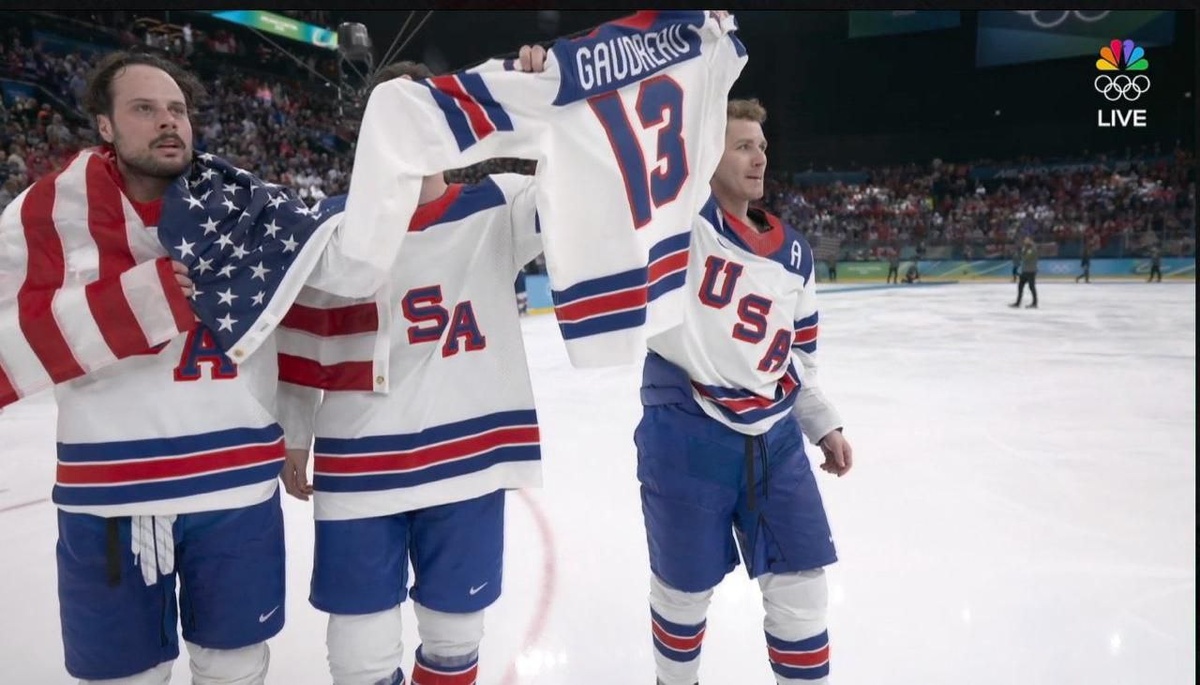 Американцы вышли на награждение со свитером Джонни Годро. Джонни по прозвищу Хоккей был на этом льду с командой, в которой обязательно был бы, если бы был жив...