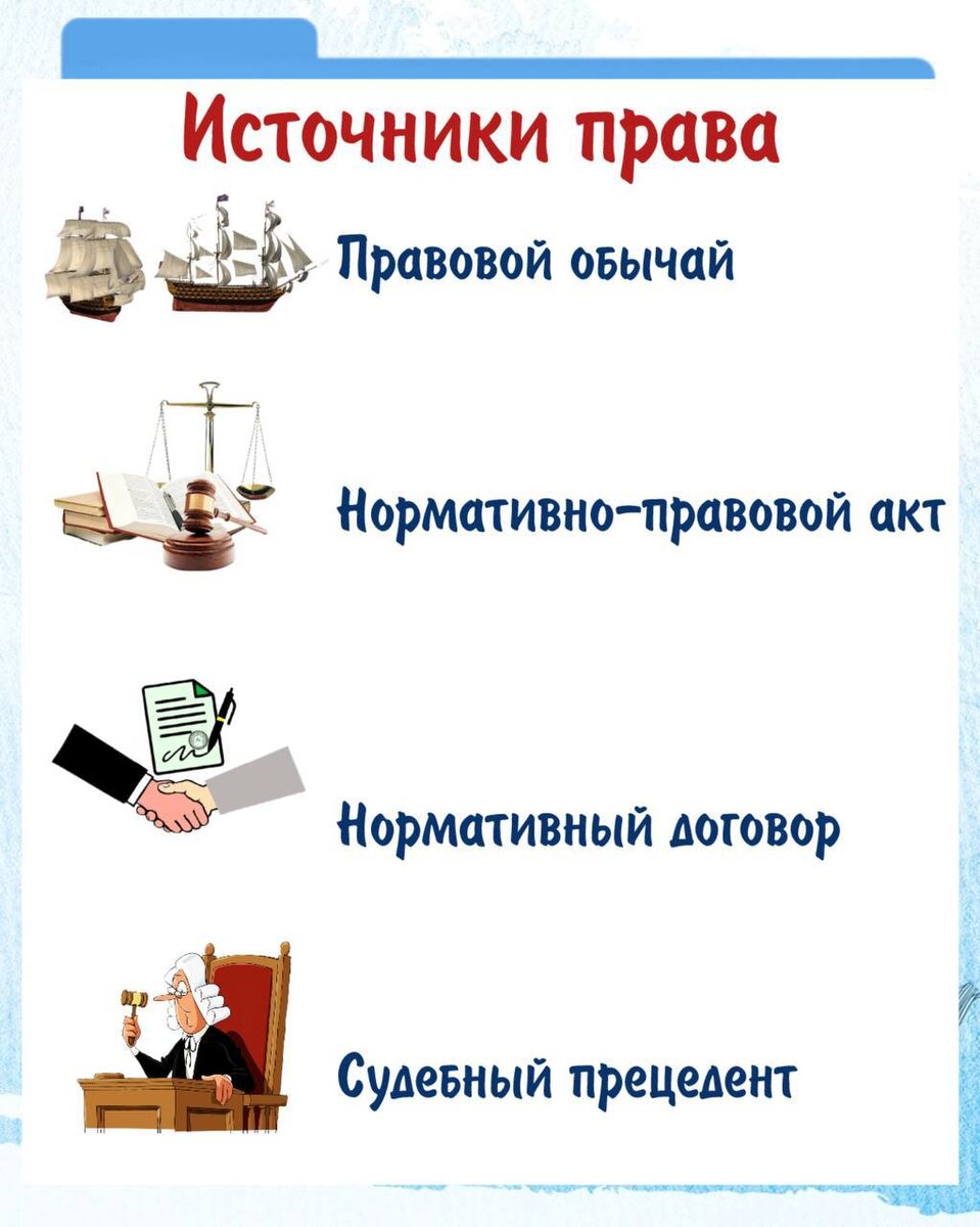 »! 🔹Правовой обычай - сложившееся в результате многократного, длительного применения, общепризнанное (в том числе государством) и повсеместно используемое правило, официально не зафиксированное в каком-либо нормативно-правовом акте. Например, Речной кодекс: меньшее судно должно уступать большему. 🔹Нормативно-правовой акт - официальный документ, принятый в пределах компетенции уполномоченного государственного органа путем референдума, содержащий общеобязательные правила поведения, рассчитанные на неопределенный круг лиц и неоднократное применение. 🔹Нормативный договор - создающий обязанности и права не только для сторон договора, но и для третьих лиц. т.е. создающий обязательные нормы, как если бы это был нормативный акт. 🔹Судебный прецедент - решение по конкретному делу, которое обязательно для применения для судов той же или низшей инстанции при рассмотрении аналогичных дел (характерно для англо-саксонского права). Не жалейте 🔥 и запоминайте материал! Мой резервный канал в
