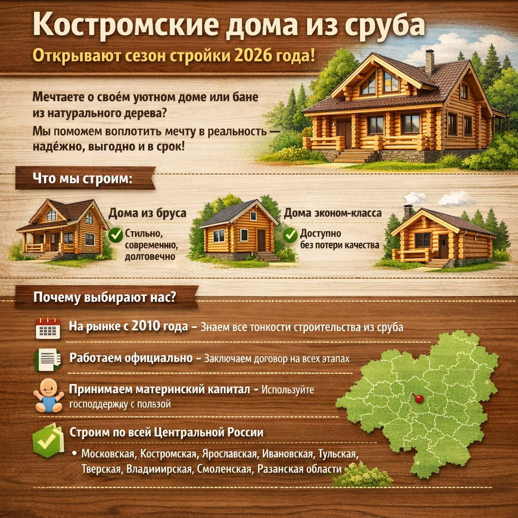 🏡 Костромские дома из сруба открывают сезон стройки 2026 года! Мечтаете о своём уютном доме или бане из натурального дерева? Мы поможем воплотить мечту в реальность — надёжно, выгодно и в срок! Что мы строим: ✔ Дома из бруса и Бревна — стильно, современно, долговечно ✔ Дома эконом‑класса — доступно без потери качества ✔ Бани — место для отдыха души и тела Почему выбирают нас? ✅ На рынке с 2010 года — знаем все тонкости строительства из сруба ✅ Работаем официально: заключаем договор на всех этапах ✅ Принимаем материнский капитал — используйте господдержку с пользой ✅ Строим по всей Центральной России: Московская, Костромская, Ярославская, Ивановская, Тульская, Тверская, Владимирская, Смоленская, Рязанская области 🔥 Только до 1 мая — эксклюзивные скидки и подарки! 🔥 Что вы получаете прямо сейчас: 1.План свайного поля фундамента — бесплатно 2. Выезд специалиста для осмотра участка — бесплатно 3. Доставка стройматериалов до 500 км — бесплатно. Свыше 500 км — всего 85 руб./км 4. Разгрузк