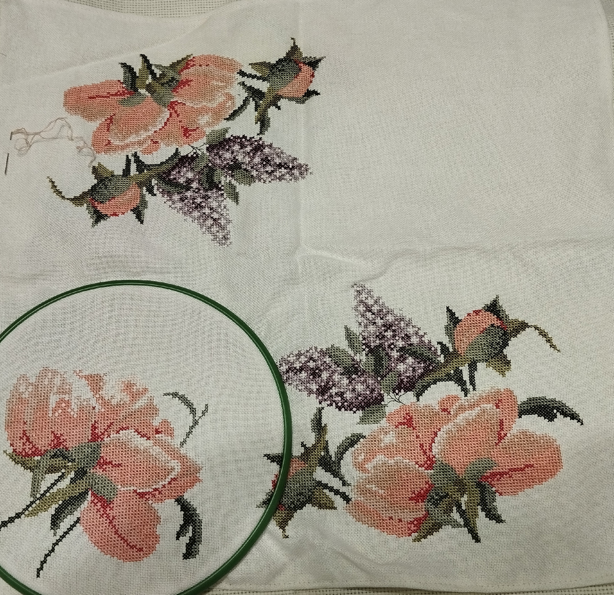 Заканчивается зима и теперь хочется вышивать цветы. У меня давно уже начаты несколько работ, решила, что продолжу их. Сколько успею, пока есть на это настроение. На салфетке осталось вышить ещё один цветок