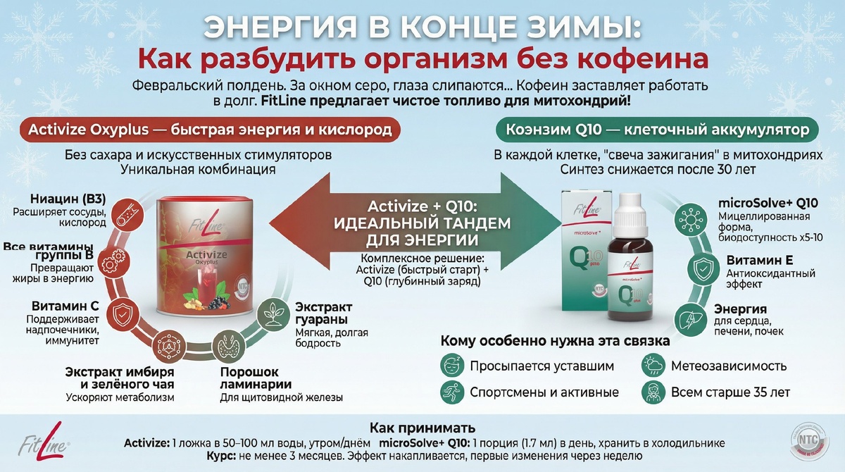 Февральский полдень. За окном серо, глаза слипаются, а до вечера ещё далеко. Кофе помогает на час, потом накатывает ещё большая усталость. Знакомо? Проблема в том, что кофеин просто заставляет организм работать в долг, истощая последние запасы. Настоящий прилив энергии возможен только тогда, когда клетки получают топливо для собственных «электростанций» — митохондрий. FitLine предлагает два продукта, которые работают на разных уровнях, но в синергии дают чистую, долгую энергию без спадов: Act 📖 Читать статью 🛒 Смотреть продукт