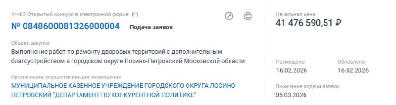 о. Лосино-Петровский разместила на портале "ЕИС Закупки" следующие закупки: - 41 476 590,51 ₽ — выполнение работ по ремонту дворовых территорий с дополнительным благоустройством в г.о. Лосино-Петровский; - 24 464 166,56 ₽ — выполнение работ по ремонту автомобильных дорог общего пользования местного значения на территории г.о. Лосино-Петровский (1 волна); - 102 532 496,50 ₽ — оказание услуг по надлежащему содержанию, аварийному обслуживанию и текущему ремонту общего имущества собственников помещений в многоквартирных домах; - 10 609 000,00 ₽— ямочный ремонт асфальтового покрытия дворовых территорий и внутриквартальных проездов в г.о. Лосино-Петровский в 2026 году; ⭐️ LPG