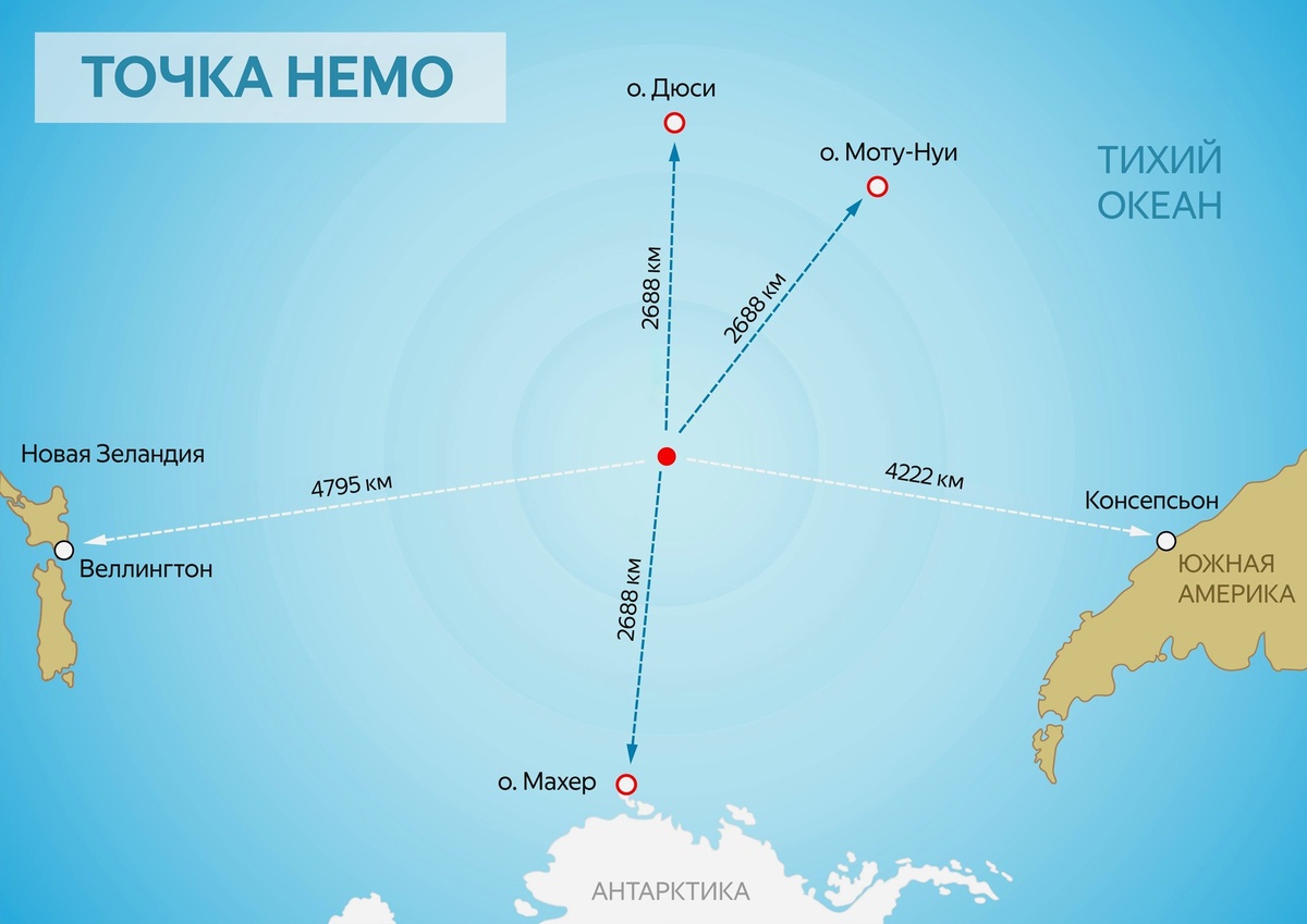 , максимально удаленная от какой-либо суши на Земле. Расстояние до трех ближайших точек суши составляет ровно 2688 километров. Она расположена в южной части Тихого океана и знаменита не только своей недоступностью, но и тем, что служит своеобразным «кладбищем космических кораблей». Из-за такой изоляции ближайшими людьми к точке Немо иногда становятся космонавты на Международной космической станции (МКС), когда она пролетает над этим районом на высоте около 400 км. Удаленность Точки Немо от суши и морских путей сделала ее идеальным местом для безопасной утилизации космических аппаратов, отслуживших свой срок. Начиная с 1970-х годов, космические агентства (Роскосмос, NASA, ESA и другие) направляют сюда отработавшие спутники, грузовые корабли и орбитальные станции. Большая часть аппарата сгорает при входе в плотные слои атмосферы, но наиболее тугоплавкие обломки падают в воды океана в районе Точки Немо. По имеющимся данным, на дне в окрестностях этой точки покоятся обломки более 260 к