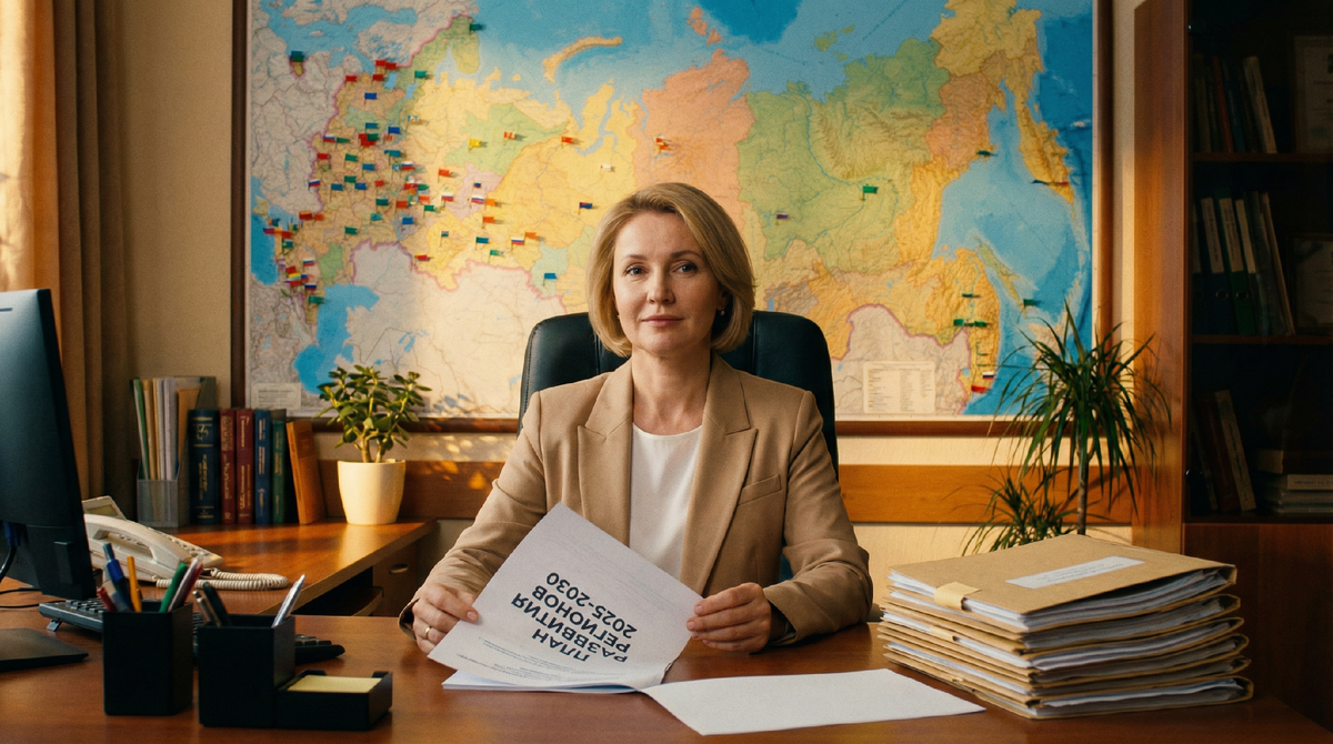 Женщина 45 лет сидит за офисным столом, держит в руке листок бумаги с текстом, на лице спокойная уверенность, за спиной — карта России с флажками, рядом стопка папок, реалистичный стиль, тёплые тона, 16:9