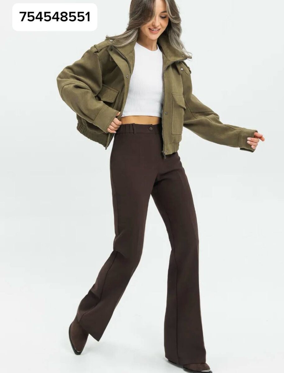 Эти брюки — тот самый силуэт, который делает ноги длиннее, а фигуру — более собранной. Клёш от колена работает как оптический приём: он уравновешивает бёдра и визуально вытягивает линию ног, особенно в движении. Высокая посадка подчёркивает талию и создаёт правильные пропорции «длинные ноги + компактный верх».