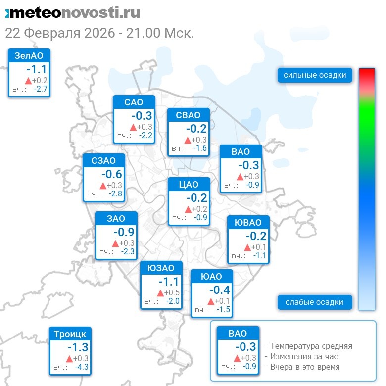 В 21:00 в Москве было от -1.8°C до +0.2°C, средняя температура -0.5°C #погода #Москва #зима #температура #22февраля #воскресенье