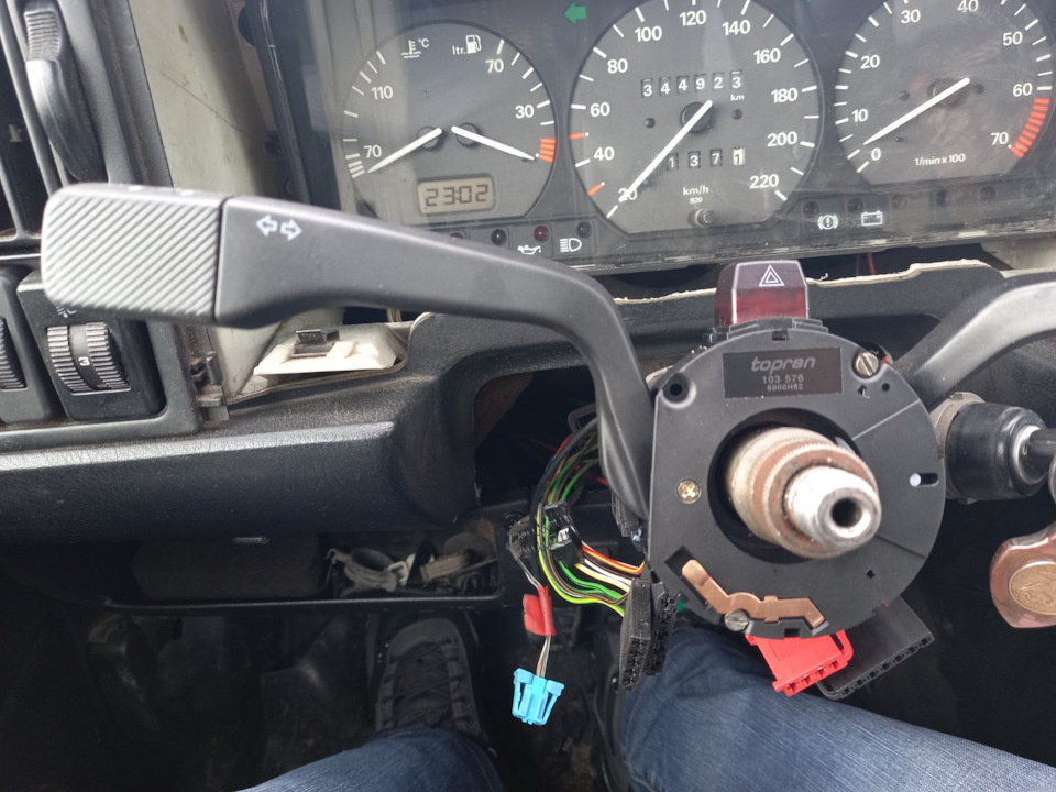 всем привет на руле снимаем кнопку нажатия звукового сигнала .запираем руль . откручиваем гайку головкой на 24 . метим руль относительно вала. снимаем руль. Отсоединяем провода от переключателей. откручиваем сам переключатель ( 3 болта) и снимаем. Снимаем разъём с контактной группы замка зажигания откручиваем шестигранником на 6 болт крепления замка. снимаем съёмником переходник руля и снимаем замок .(так же можно поменять контактную группу) всем спасибо