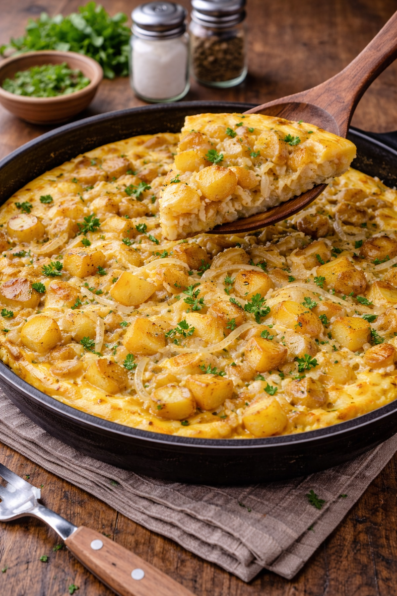 Бывают дни, когда хочется чего-то простого и горячего, но без лишних усилий. Чтобы и сытно было, и готовилось быстро. Я вообще люблю такие рецепты — без сложных ингредиентов, без долгих подготовок. Потому что вкусно поесть я люблю, а вот стоять у плиты долго — не очень. Этот омлет — отличный способ использовать оставшуюся варёную или жареную картошку. А если её нет — всё равно готовится быстро. На 2–3 порции хватает спокойно. Что понадобится: Картофель — 3–4 средних (если сырой — около 500 г)