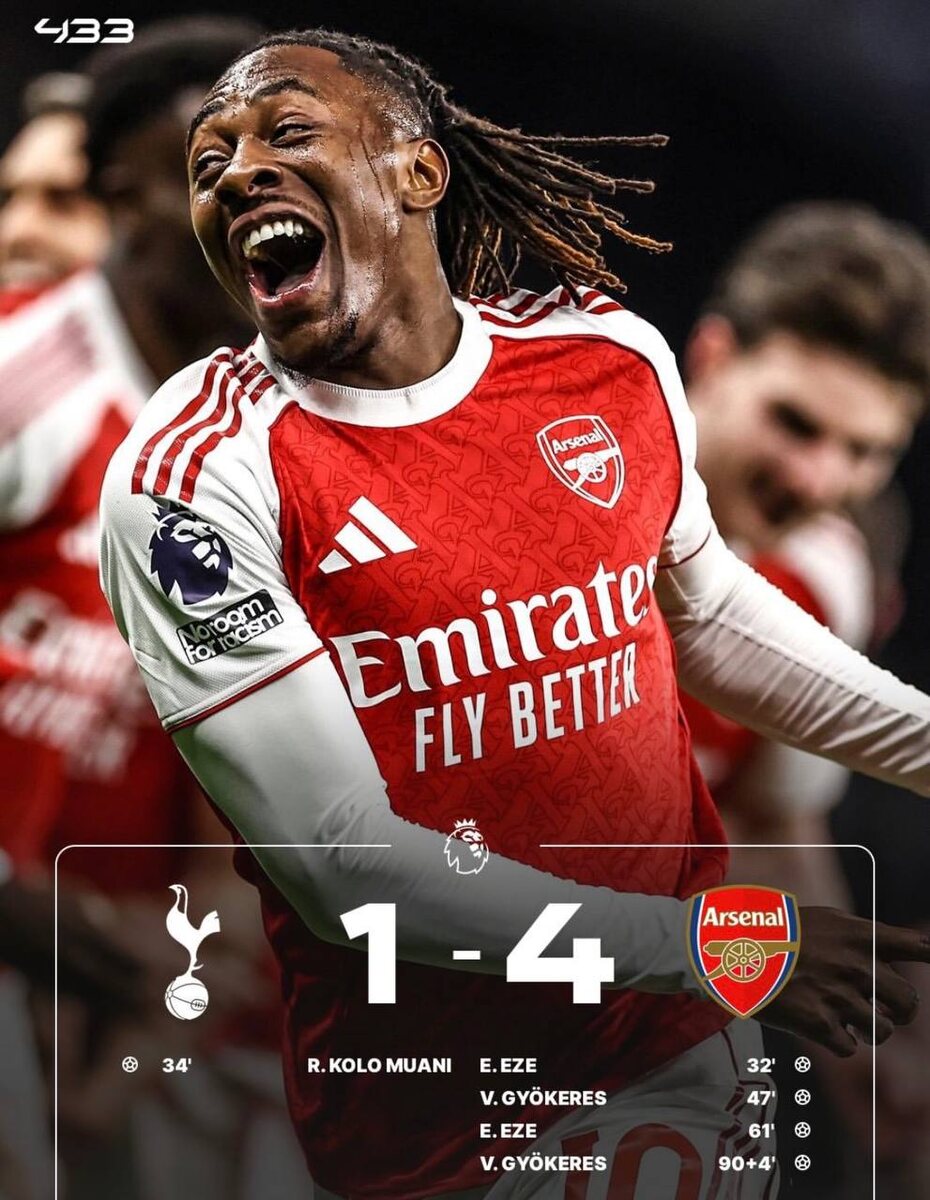 Дьекереш и Эзе оформили по дублю 😎 Эберечи забил семь голов за новый клуб, пять из них — в ворота «Тоттенхэма». Неплохая статистика 🙃 В этом сезоне у «Арсенала» 0 поражений в матчах с лондонскими клубами, а у «Тоттенхэма» – 0 побед в АПЛ в 2026-м. 🏴 «Арсенал» – 61 очко 🏴 «Ман Сити» – 56 очков (матч в запасе) ⚽️ Подписывайтесь на нас в MAX
