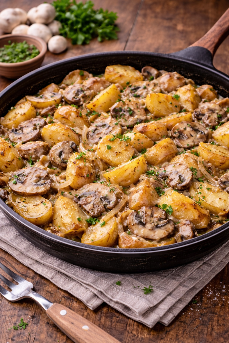 Иногда не хочется ни мяса, ни сложных соусов. Просто картошка, грибы и что-то горячее на ужин. Я вообще люблю такие рецепты — понятные, из обычных продуктов и без лишней суеты. Вкусно поесть — это да. А вот готовить часами — не моя история. Эта картошка с грибами — один из самых простых вариантов. Всё делается в одной сковороде, без духовки и без лишней посуды. Получается ароматно, мягко и очень по-домашнему. На 3 порции хватает спокойно. Что понадобится: Картофель — 1–1,2 кг (90–140 рублей)