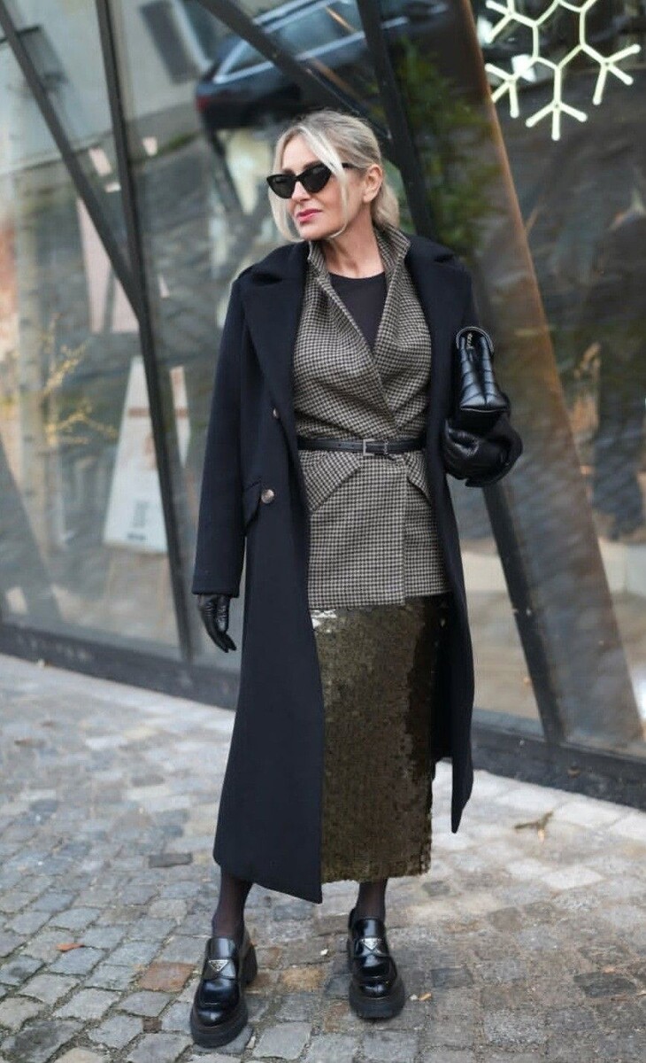 Каждая женщина может наряжаться стильно, эффектно и модно, вне зависимости от особенностей фигуры и возраста. Хотите одеваться так? Тогда вперед, преодолевая предрассудки и выбирая для себя только то, что нравится. 1. Стильный повседневный «лук» с контрастом фактур – блестящая коричнево-зеленая юбка до лодыжки, базовая черная футболка, серый в мелкую черную клетку жакет, в талии перетянутый черным ремешком, и классическое удлиненное черное пальто. Сдержанная цветовая гамма наряда немного сглаживает впечатление от сочетания контрастных фактур, позволяя образу выглядеть оригинальным, но гармоничным. 2. Демократичный и в то же время стильный образ – лаконичные прямые джинсы светло-синего цвета, удлиненный кашемировый свитер с высоким горлом и серо-черный жакет оверсайз классического кроя. Простое сочетание базовых предметов гардероба отлично дополнят черные ботильоны с острым мысом, в которых можно комфортно вести активный образ жизни. 3. Эффектный наряд для женщины, знающей все о своей п