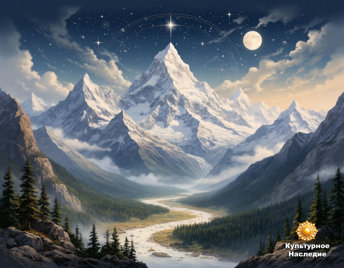 В священных гимнах Вед описывается гора Меру — центр мироздания, окружённый золотыми вершинами. С этих гор берут начало все великие потоки: одни устремляются к тёплому морю на юге, другие — к белопенному океану на севере. Полярная звезда стоит в центре небес, а над вершинами сверкают семь звёзд Большой Медведицы.