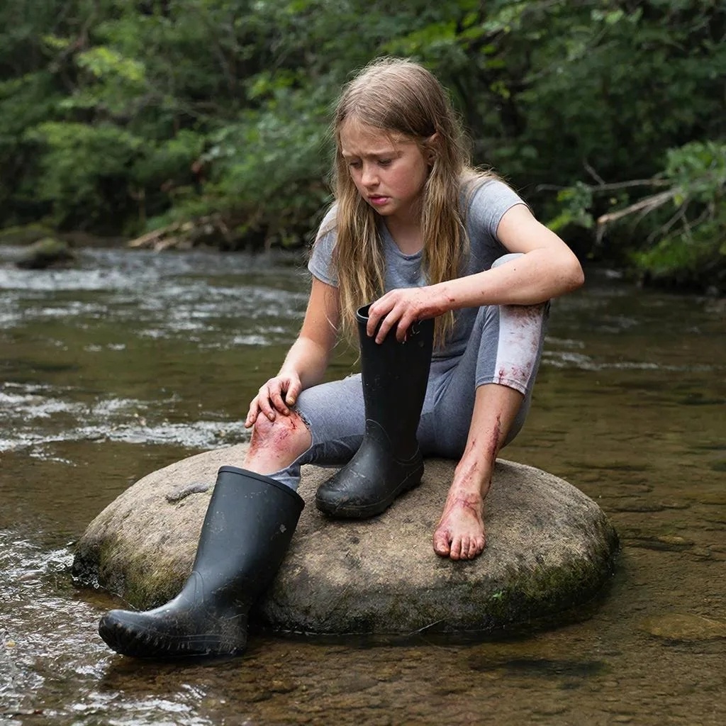На ручейке, перейдя деревянный мостик, Ленка решила сделать перерыв. Ей было неудобно идти, так как в одном резиновом сапоге хлюпала вода. Только вот когда она успела начерпать сапог воды, Ленка не могла припомнить. Присев на большой валун на берегу ручейка и сняв сапог, Ленка увидела окровавленную ногу. Ничего не понимая, откуда идёт кровь, она закатала штанину по колено и увидела, что нога в области колена была разрезана, как будто коленка весело улыбнулась. Повертев головой и поняв, что подорожником здесь не обойтись, Ленка думала, чем завязать ногу. В этот момент из крайнего дома, рядом с ручейком, вышла женщина с вёдрами. Она спускалась к Ленке.