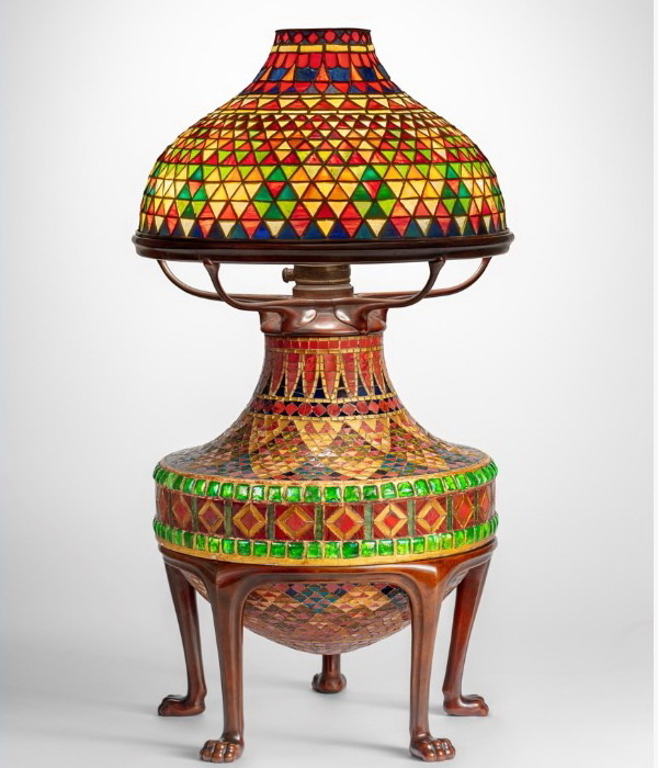 Поездка на Ближний Восток была непременным этапом творческого становления для европейских и американских художников второй половины XIX века. Луи Комфорт Тиффани не стал исключением: с декабря 1875 по февраль 1877 года Тиффани посетил Алжир и Испанию, и, по всей вероятности, именно тогда он впервые увидел Альгамбру – дворец в Гранаде, блистательный шедевр исламской архитектуры и декора. Художник был настолько пленен экзотическими орнаментальными мотивами, встречавшимися там повсюду, что впоследствии собрал обширную коллекцию исторических фотографий дворца и запечатлел его на нескольких своих полотнах. Поэтому неудивительно, что именно влияние Альгамбры прослеживается в декоре этой лампы, одном из первых творений фирмы «Tiffany Studios» в технике свинцового стекла и великолепном образце мавританских мотивов в наследии Тиффани. Это же влияние можно заметить и в декоре дома Лорелтон-Холл на Лонг-Айленде, который он спроектировал и построил для себя и своей семьи в период с 1902 по 1905 год.