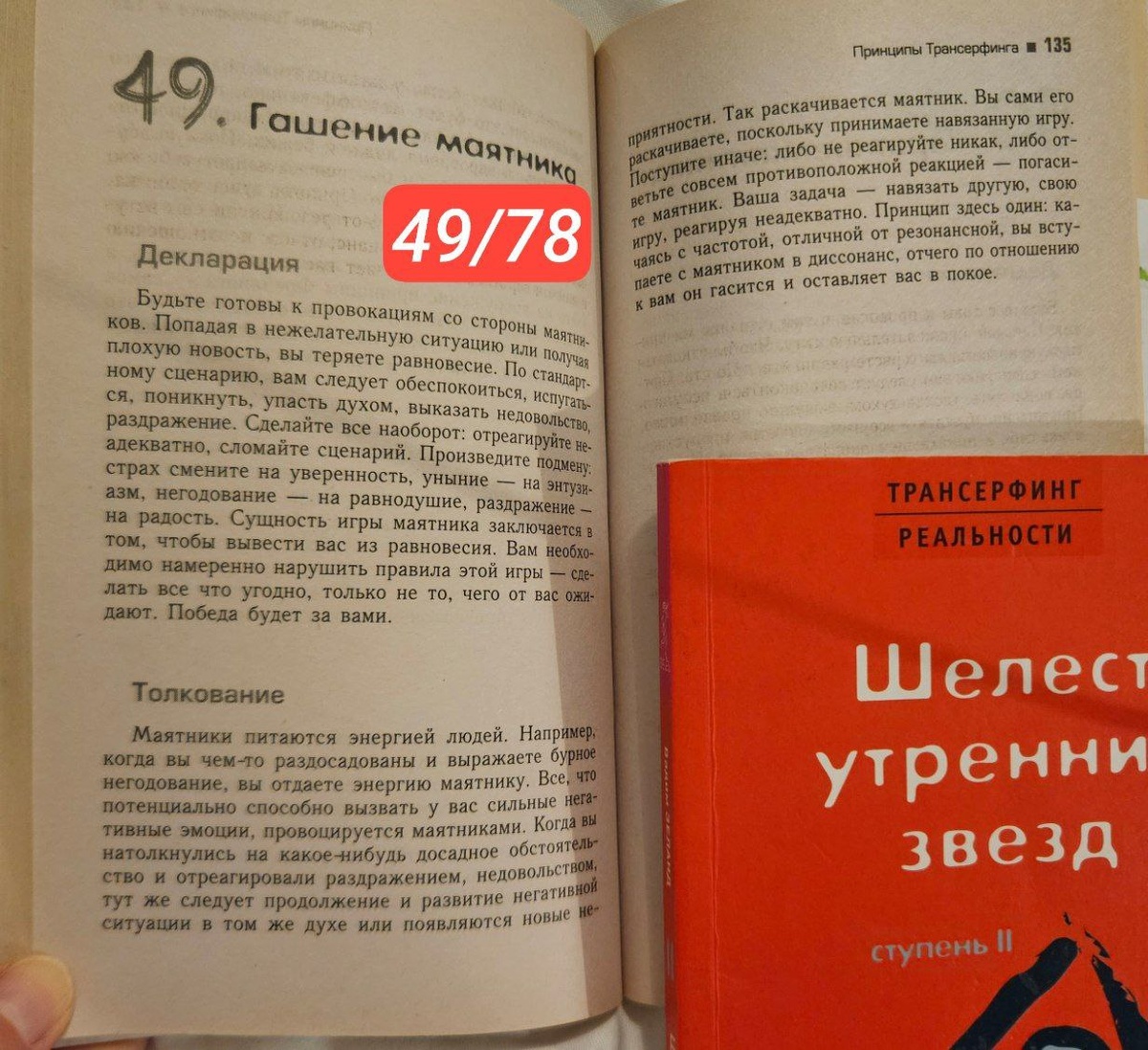 49/78 Практикум управления реальностью - Трансерфинг Гашение маятника "Попадая в нежелательную ситуацию или получая плохую новость, вы теряете равновесие. По стандартному сценарию, вам следует обеспокоиться, испугаться, поникнуть, упасть духом, выказать недовольство, раздражение. Сделайте все наоборот: отреагируйте неадекватно, сломайте сценарий. Произведите подмену: страх смените на уверенность, уныние на энтузиазм, негодование - на равнодушие, раздражение - на радость. " "Когда вы натолкнулись на какое-нибудь досадное обстоятельство и отреагировали раздражением, недовольством, тут же следует продолжение и развитие негативной ситуации в том же духе или появляются новые неприятности." ❣Тут, на мой взгляд, речь не идёт о подавлении эмоции или о самообмане, мол "да, мне всё равно", хотя при этом внутри буря эмоций, а о глубинной смене отношения к происходящему на доверие Миру, основанном на том, что Вселенский Разум знает менее энергозатратный и более оптимальный путь к нашей цели,