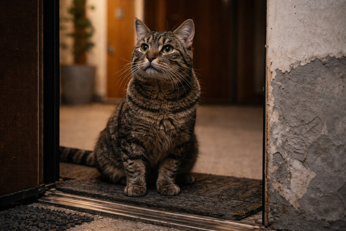 Открыл дверь — и на коврике перед квартирой сидел он. Хвост трубой, усы вперёд, морда чуть исцарапана, шуба помята, но взгляд — из серии «я тут не случайно».