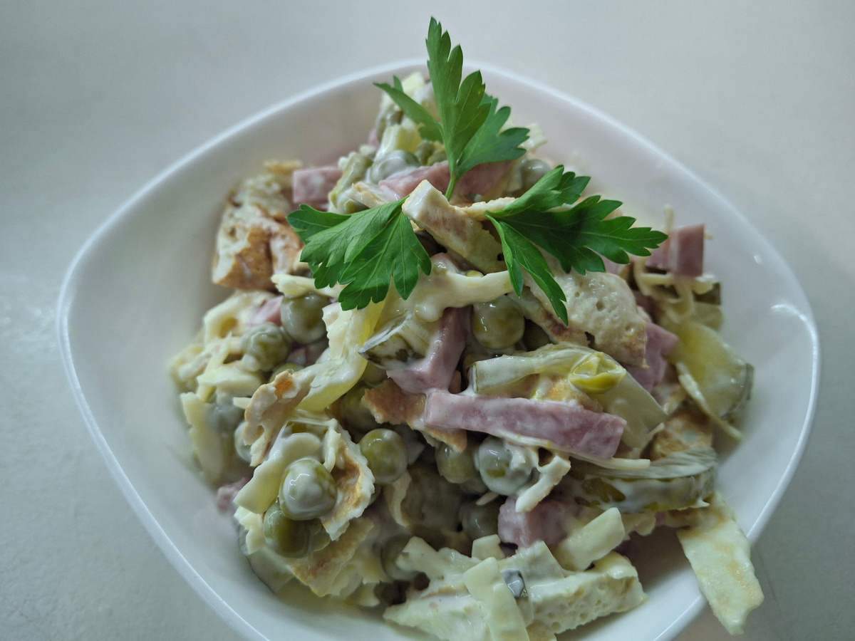 Яйца взбиваем. Жарим омлет, в три прима. Слегка смазываем сковороду маслом.